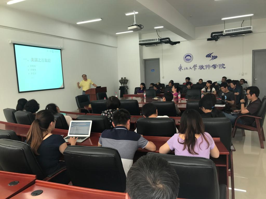 周福才教授首先介绍了此次实地走访的斯坦福、伯克利、麻省理工、哈佛、波士顿大学等世界顶尖高校在专业、学科建设和人才培养方面的先进经验,并指出“人才培养,文化为先”。随后,周教授又向大家展示了思科、Facebook、英特尔、谷歌等世界顶尖企业的企业文化和发展历程,使大家深刻体会到先进的技术不一定意味着好的产品,不一定就不意味着好的产业。我们在人才培养时,不仅要考虑技术人才,也应该考虑产业人才。最后,与会教师与周教授就美国的教育体制、人才培养、文化内涵等方面进行了交流,教师们踊跃发言提问,气氛活跃。