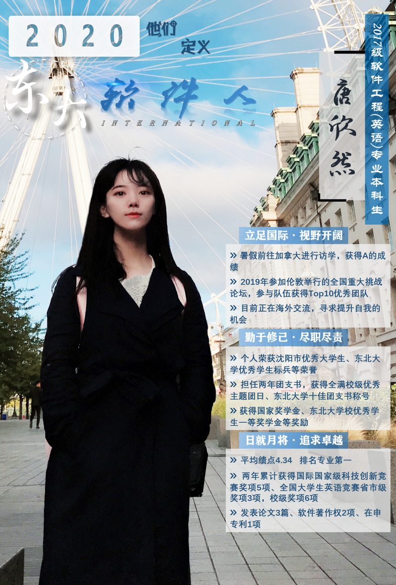 唐欣然,开云kaiyun登录入口软件工程(英语)专业大三学生,入学以来平均绩点为4.34分,排名专业第一,可以说是个妥妥的学霸。大一大二两学年作为团支书尽职尽责,带领团支部获得12次校级优秀、开云kaiyun登录入口先进班集体和开云kaiyun登录入口活力团支部称号。她所获得的奖项,真可谓乱花渐欲迷人眼,令人眼花缭乱。个人荣获沈阳市优秀大学生、开云kaiyun登录入口优秀学生标兵、开云kaiyun登录入口十佳团支书等荣誉,获得国家奖学金、开云kaiyun登录入口校优秀学生一等奖学金等奖励基金,两年累计获得国家国际级科技创新竞赛奖项5项,省市级奖项3项,校级奖项6项。在申专利1项、发表软件著作权2项、论文3篇。