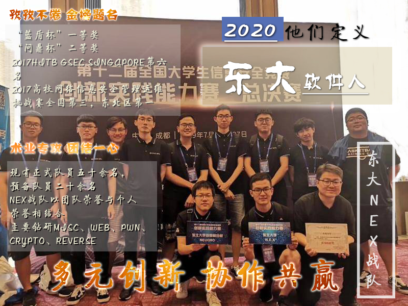通过参与各类贴近实战的‘硬核’网络安全竞技比赛,目前NEX战队在国内已经享有一定的知名度,在东北地区高校中处于第一梯队。