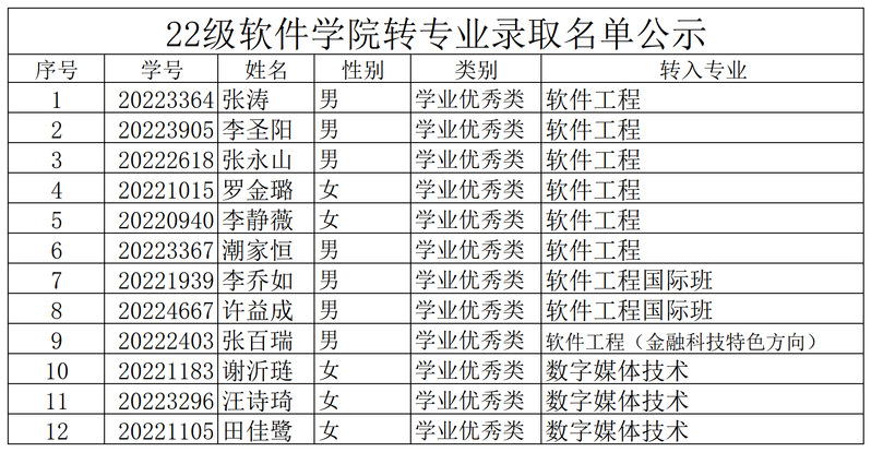 22级开云kaiyun登录入口转专业录取名单公示