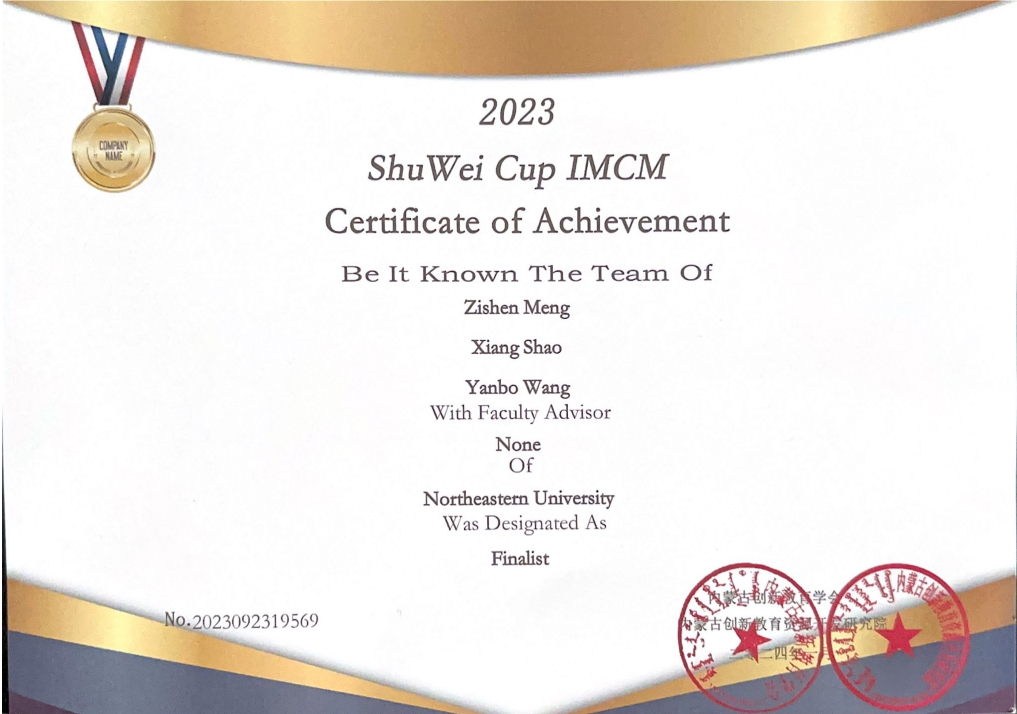 在数维杯国际赛中,建立了基于节水频率优化的洗衣模型和Chebyshev距离的衣物聚类模型,获得了数维杯国际赛特等奖提名奖(Finalist)。