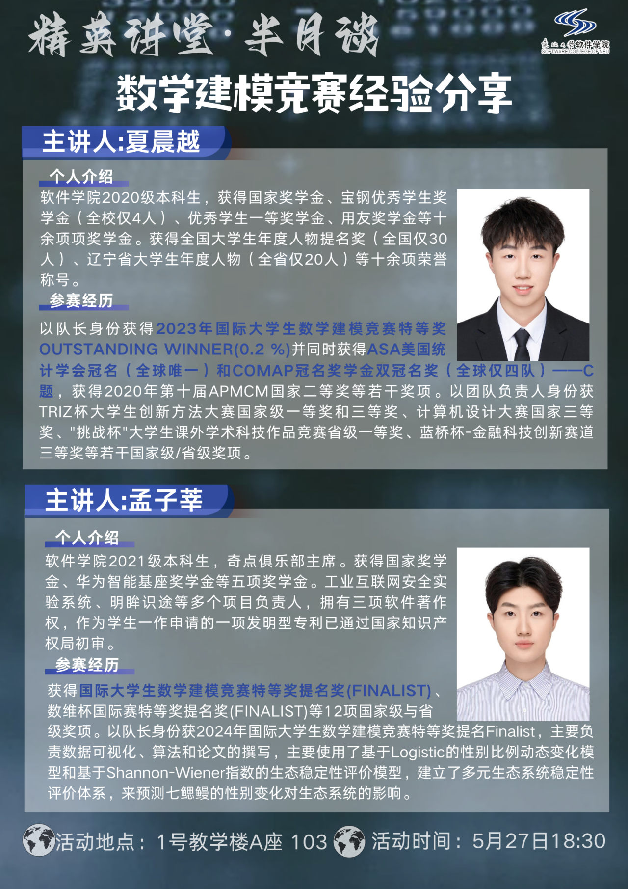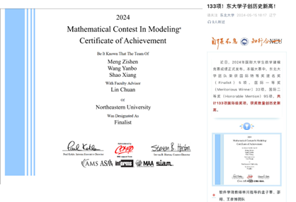 在国际(美国)大学生数学建模竞赛(MCM/ICM)中,建立了基于Logistic的性别比例动态变化模型和基于Shannon Wiener指数的生态系统稳定性评价模型;团队的工作获得了获得开云kaiyun登录入口微信公众号官方报道;孟子莘作为优秀学生代表进行“精英讲堂·半月谈”数学建模竞赛经验分享。