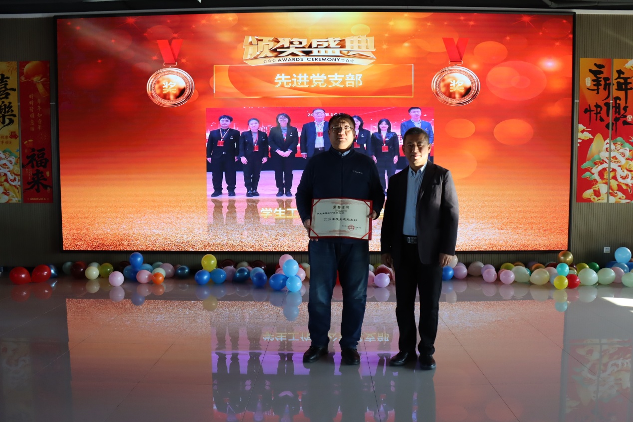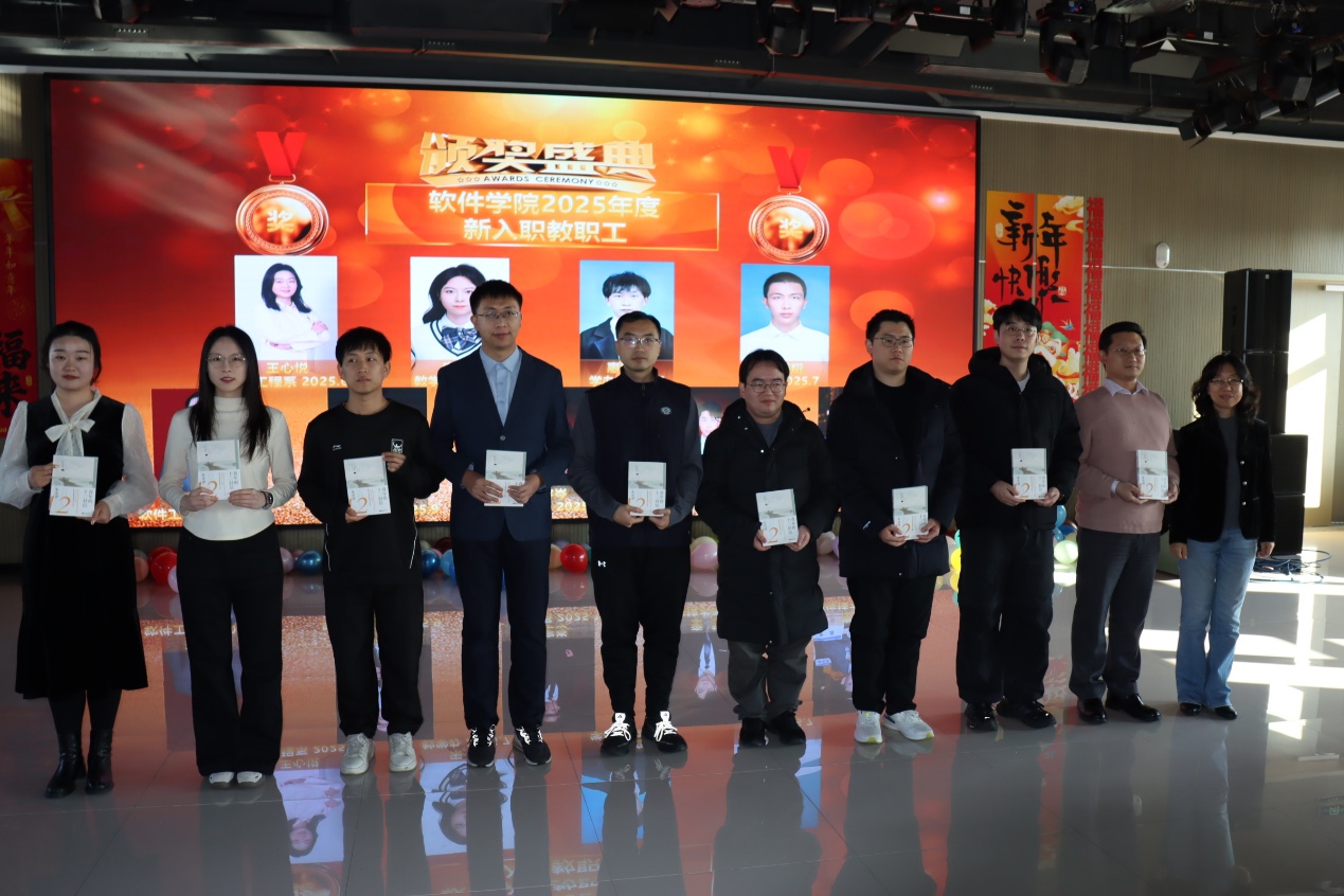 学院党委书记滕超宣读了学院对2025年度“两优一先”、先进个人和专项获奖人员表彰的决定。学院领导班子成员为获奖的集体和个人颁奖,为光荣在党和在院工作超10年并逢5逢10年份的党员和教职工颁发了纪念牌。颁奖结束后,为2025年新入职的9位教职工举行了入职仪式。